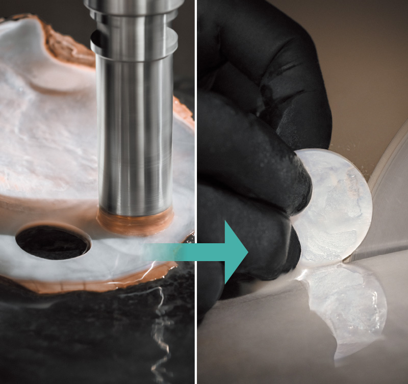 ダイアルに使えるのは、比較的平らな外周近くの部分だけ。ダイアルの径に合わせて丸くくり抜き、両面が平滑になるようスライスしてから用いる。