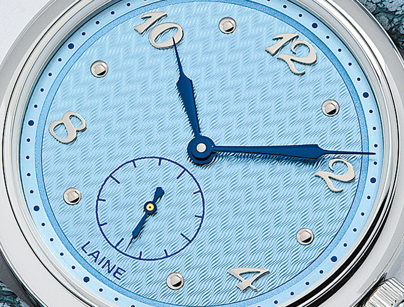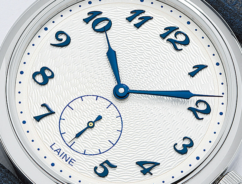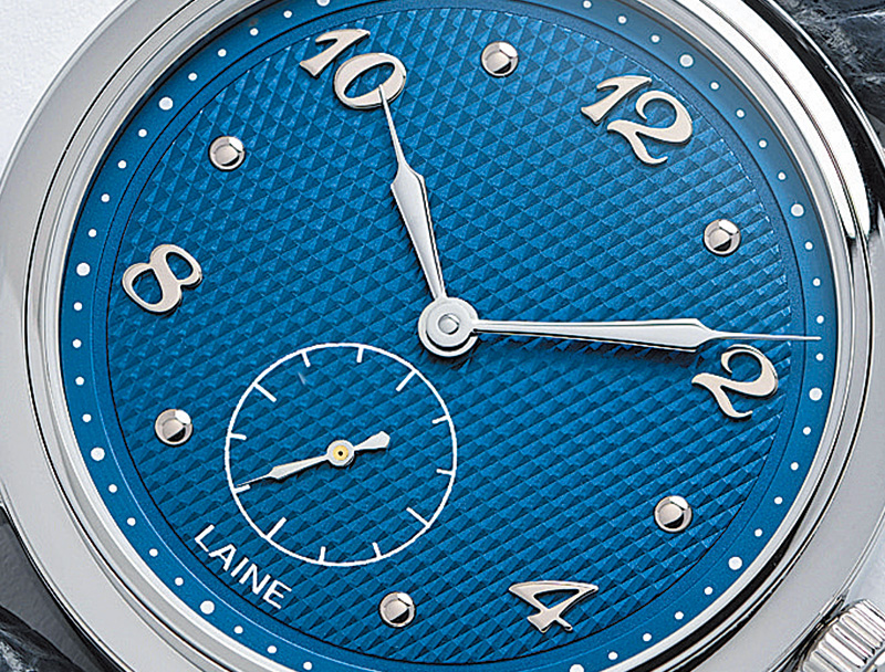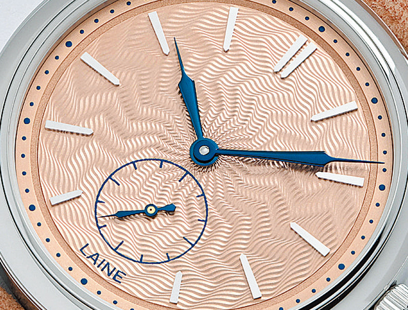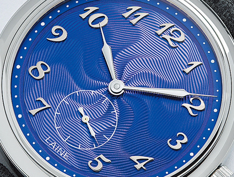 ギョーシェ(ギヨシェ)は、連続したパターンを厚い円盤の側面や金属盤の凹凸で表し、それをパンタグラフなどで縮小して手回し旋盤で金属盤に彫り込む手法を指す。技術の確立は17世紀といわれ、ブレゲが1786年、ダイアルに応用した。当時と同じ原理の手動旋盤はブレゲ以外では作られておらず、他社は古い機械を直しながら技術を継承している。ギョーシェを模した型打ちダイアルもあるが、模様の明確さで彫りが勝る。ライネは古い手動旋盤を持つ小メゾン。複数の原盤を有し、多彩なパターンを展開している。