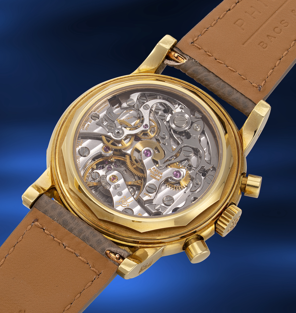 オークションに出品された個体は1989年製。ケースの素材は18Kイエローゴルドで、直径は36㎜である。シースルーバックからは、ヌーベル・レマニア製のエボーシュをブラッシュアップした美しいムーブメントを観賞することが可能だ。