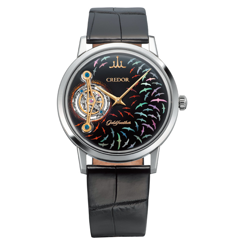 新型トゥールビヨンを収めたケースは、8.6mm厚という極薄をかなえた。ダイアルは漆芸家、田村一舟氏の手で鳥の飛翔が表現された。限定10本(うち国内7本)。手巻き。径38.6mm。Ptケース。クロコダイルストラップ。2530万円。