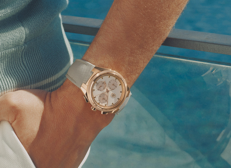 自社製一体型クロノにノーデイトが新登場。バーリーコーン(大麦の穂)ギヨシェの工芸美が一層引き立った。ムーブメントは毎秒10振動のハイビートながら65時間駆動を実現し、COSC認定クロノメーターを取得。自動巻きローターは22金製。自動巻き。18KRGケース。ラバーストラップ。755万7000円。