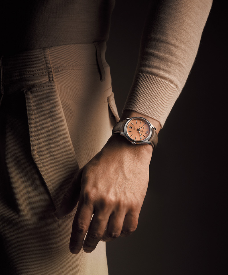 12をアラビア数字とし、日付窓を6時位置に移した新装。このサーモンダイアルは新色であり、他社より深い色味で落ち着いた印象を醸し出す。ベージュに加え黒のストラップが付属し、工具なしで付け替えられる。限定350本。自動巻き。SSケース。カーフストラップ(ブラックカーフストラップ付属)。51万1500円。