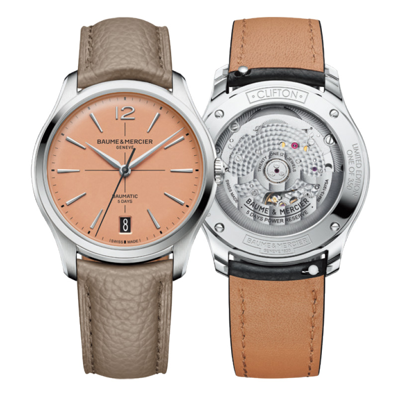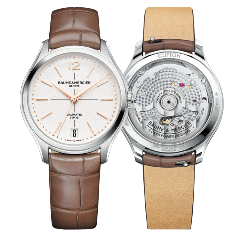 高精度、高耐磁、5日巻き──「ボーマティック」ムーブメントは、デイリーユースとしての実用性を追求し生まれた。高効率な自動巻きでもあり、針合わせや巻き上げをする頻度は低く、機械が苦手な方にも取り扱いやすい。気品あるデザイン性はペアに向く。