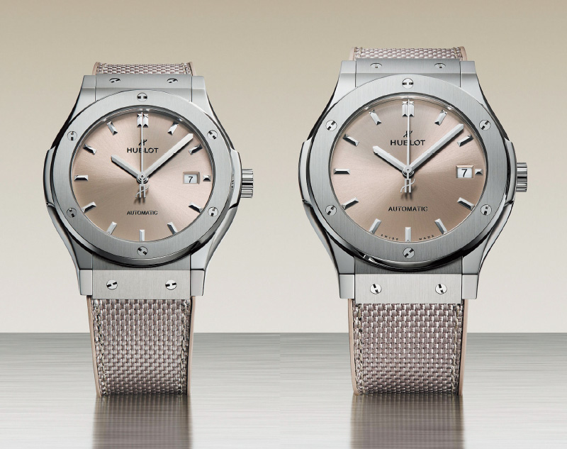 ペアウォッチの王道である同じデザインと色のサイズ違いの選択肢が、ウブロなら実に豊富だ。これらはオンライン限定の"エッセンシャル"シリーズの新作。ブラウンとグレーの中間色トープは性差を問わず、ペアウォッチとして最適でまたトレンド感もある。いずれもケースは大振り。ペアで堂々と腕に誇ろう。