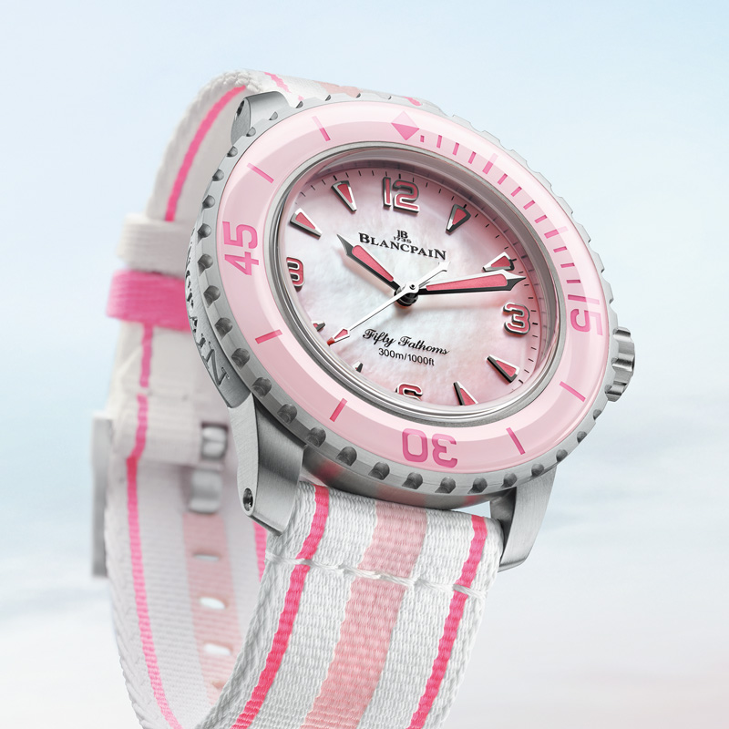 かってないカラーリングで、新境地を開いた新作。ピンクのグラデーションに彩色したMOPダイアルは、華憐な花のよう。軽く頑強なチタンケースは、300m防水とタフ。元来はミリタリーなNATOストラップも、フェミニンに装った。自動巻き。チタンケース。NATOストラップ。257万4000円。
