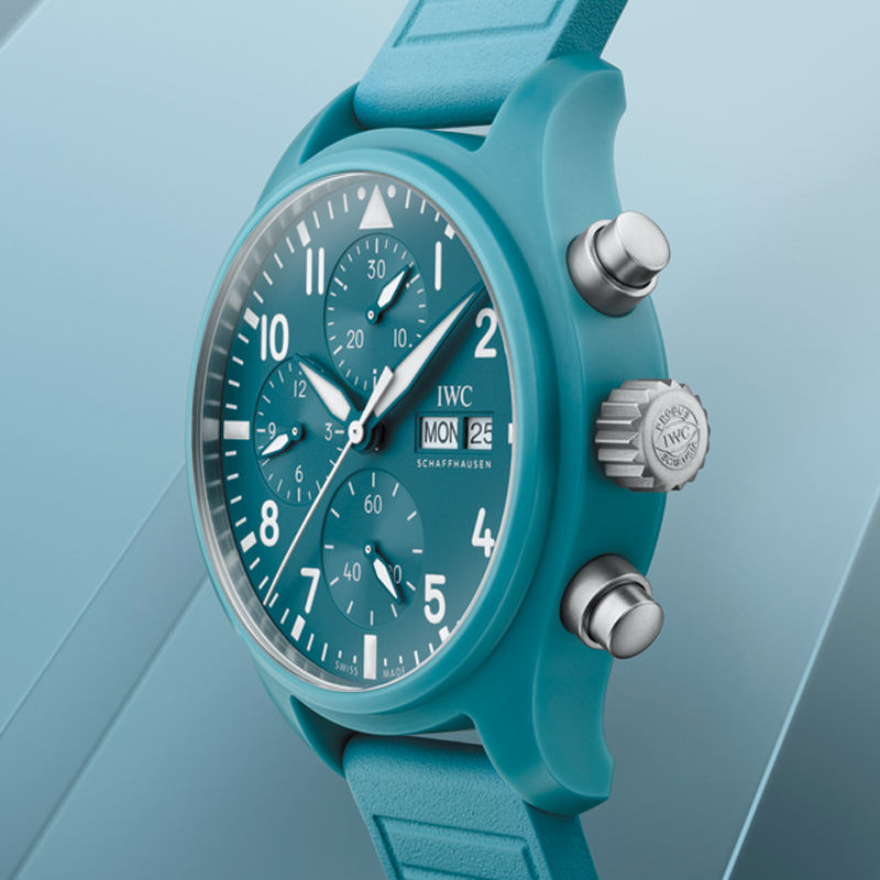 トップガンの教官が着るTシャツの色に範を採った、ライトブルーのセラミックを新開発。ダイアルとストラップも同色としたトーン・オン・トーンの外観に、インデックスや針の白が爽やか。自社製Cal.69380搭載。限定1000本。自動巻き。径41.9mm。セラミックケース。ラバーストラップ。206万8000円。