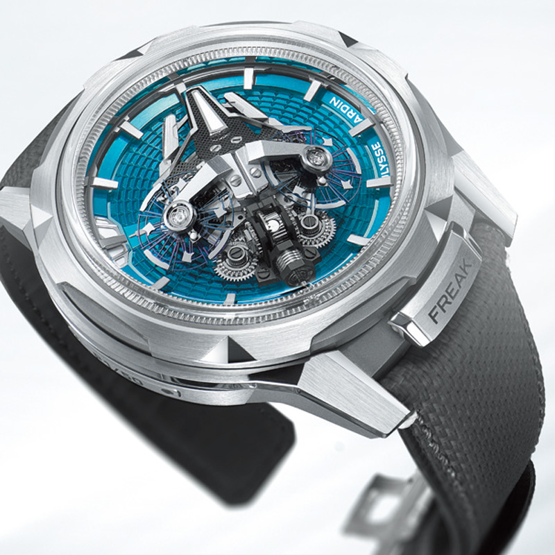 20度に傾いた2つのシリコン製テンプを持つムーブメントが自転し、分針となる。驚愕機構の「フリーク S」ダイアルが、初のエナメルをまとった。伝統的な高温焼成で、ギヨシェを透かし見せるフランケが見事。限定50本。自動巻き。径45mm。チタンケース。ラバーストラップ。2675万2000円。