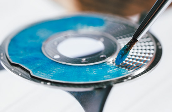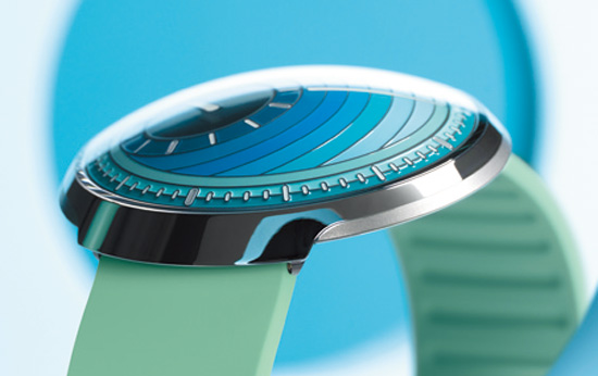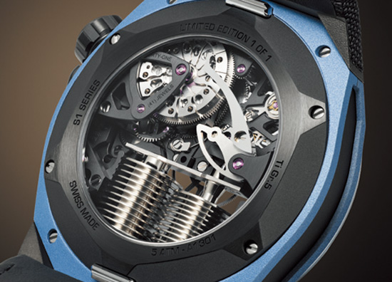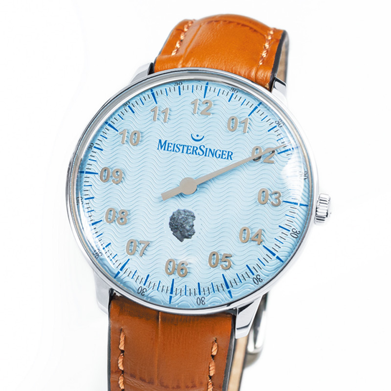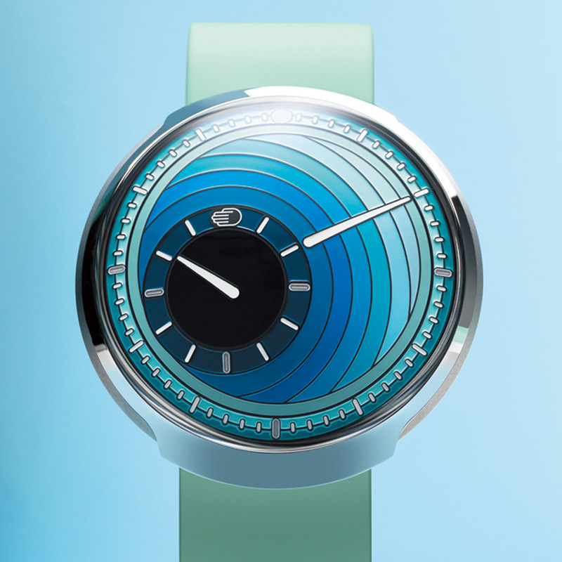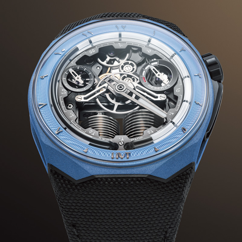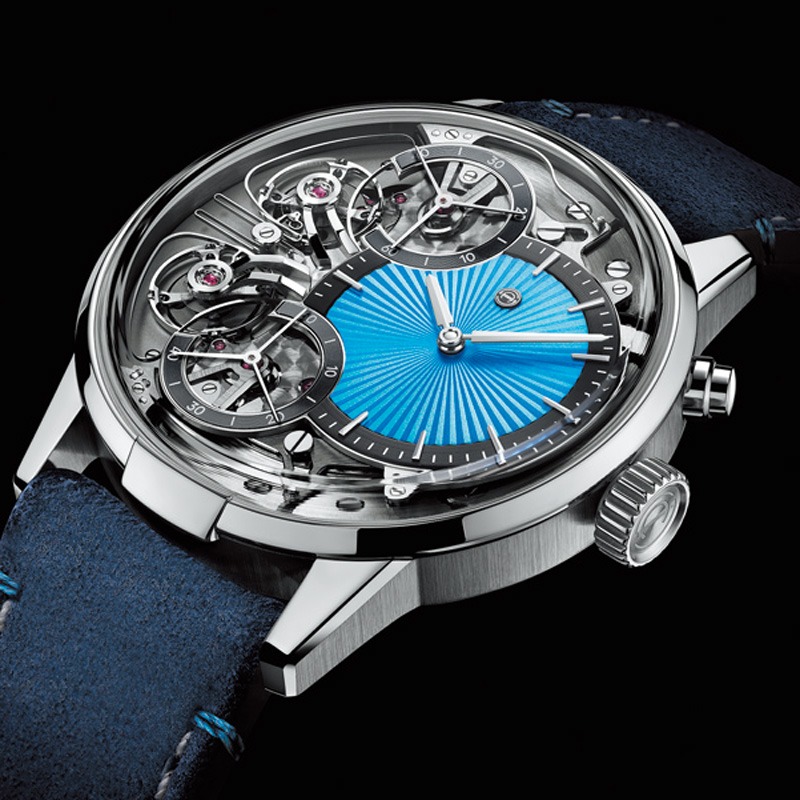 ドイツの現代芸術家ダニエル・エンゲルバーグとコラボ。全体が回転して分を示す独自機構のダイアルがブルーの色彩豊かな美をまとった。平面上でも奥行きのある不思議な感覚に陥る。限定40本。自動巻き。径42.9mm。チタンケース。ラバーストラップ。365万7500円。