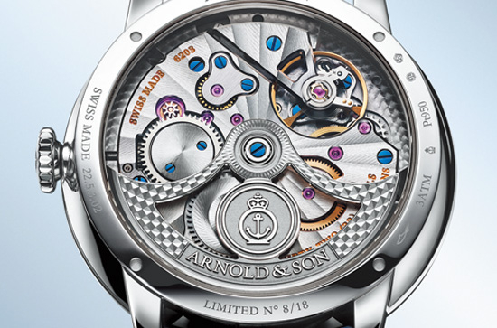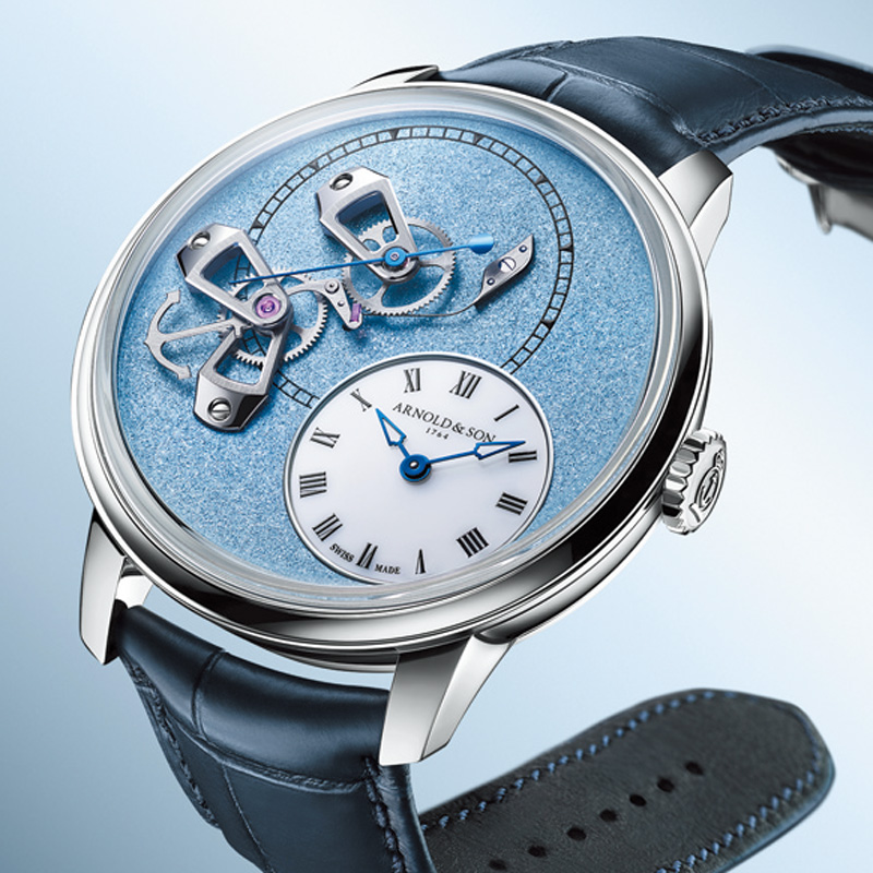 ダイアル左上の2つのブリッジが支えるのは、下側の回転をアンクルが1秒毎に変換して上の歯車に伝えるトゥービートセコンド機構。ダイアルは、グレイン仕上げとPVDでアスコットブルーに。限定18本。自動巻き。径42mm。Ptケース。アリゲーターストラップ。価格要問い合わせ。