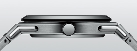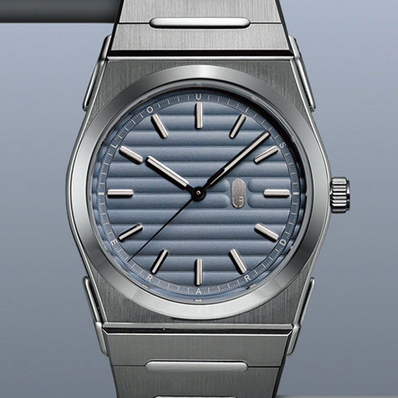 ブレスレット統合型の新コレクションが誕生。ケースは多ピース構造で、ブレスも含め鏡面部はSS、サテン部はチタン製。そのブレスのセンターリンクに似たボーダーが連続するダイアルは、淡く粋なスレートブルーに仕立てた。自動巻き。径40mm。SS+チタンケース&ブレスレット。75万9500円。