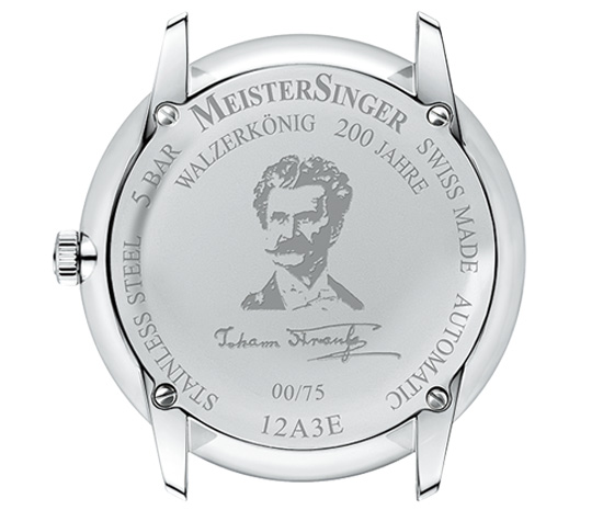 小ぶりな36mmケースに、ドーム型風防とライトブルーダイヤルを組み合わせたクラシックな1本は、ドナウ川の美しい煌めきを思わせる。裏蓋にはヨハン・シュトラウスのサインと限定番号が刻まれている。世界限定75本。自動巻き。径36mm。SSケース。カーフストラップ。38万5000円。