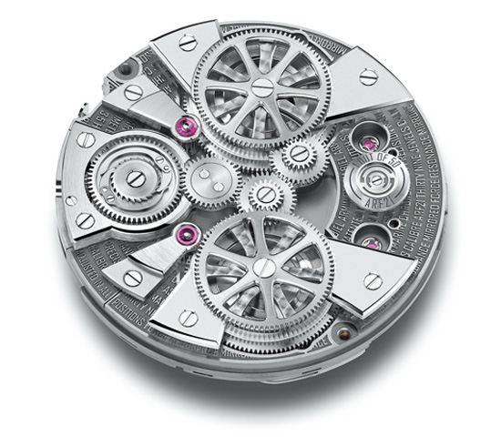 逆方向に振動する2つのテンプが共振し、高精度を得る独自のレゾナンス・クラッチ機構を装備。オフセットしたダイアルは、氷のように清冷なブルーと手彫りギョーシェによる力強いサンレイ模様で、奥行きのある輝きを放つ。限定15本。手巻き。径43mm。SSケース。カーフストラップ。1540万円。
