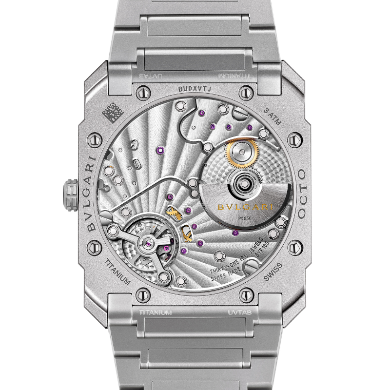 オクト フィニッシモ 径37㎜。チタンの仕上げ違いモデル。超薄型サテンポリッシュ加工チタン製ケース&ブレスレット。ロジウムプレートの針とインデックス。シースルーケースバック。72時間パワーリザーブ。30m防水。270万6000円。発売時期未定。