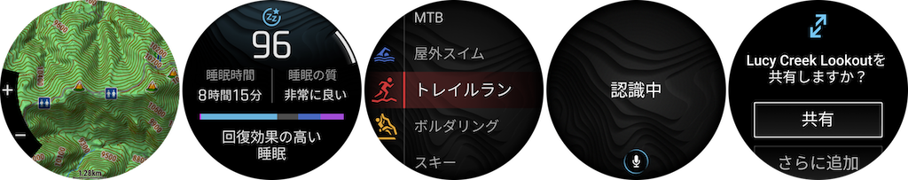 左から、登山地図、睡眠スコア、スポーツアプリ、音声コマンド、Garmin シェア。