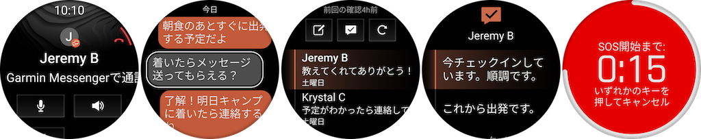 左から、通話受信、メッセージ送受信、メッセージの履歴、Messenger チェックイン、SOS 発信。