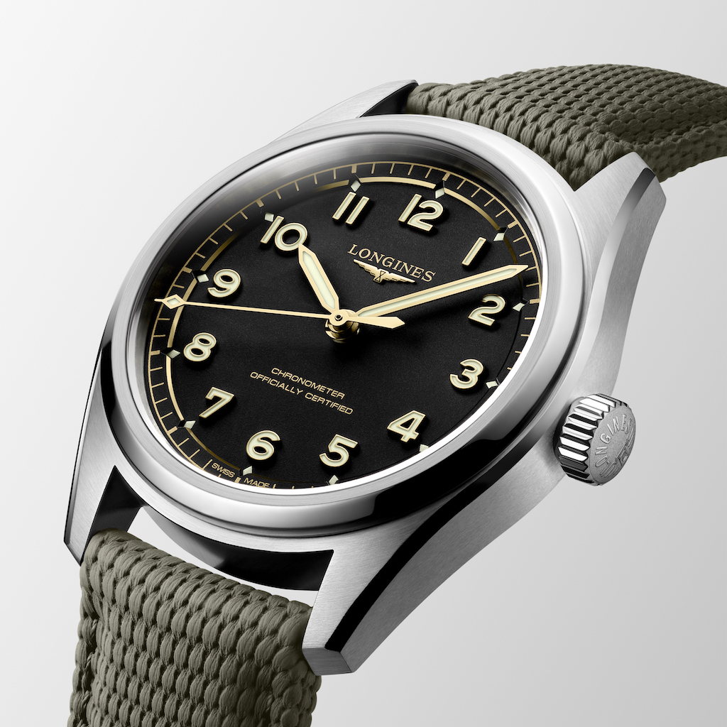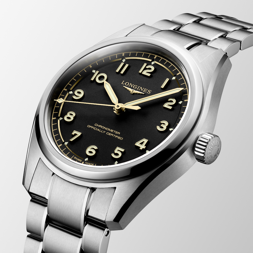そして3針モデルにも「ロンジン スピリット パイロット」の名で新作が登場。これまでのケース径40㎜とケース径37㎜の中間となる、39㎜モデルが誕生した。人間工学に基づき再設計された39㎜ケースは、着け心地が向上。またこれまであった「5つ星」と「日付表示」をなくし、ミニッツトラックはより明瞭化された。