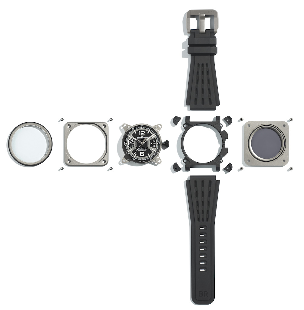 この最上位ムーブメントを収めているのが、41㎜サイズのマルチレイヤー構造ケース。「BR-X3 ブラック チタニウム」では、上下2枚のフレーチタンプレートが全てのコンポートメントをしっかりと固定。加えてケース四隅の4本のネジが、チタンプレート、ミドルケース、ベゼル、ケースバックを確実に固定する。