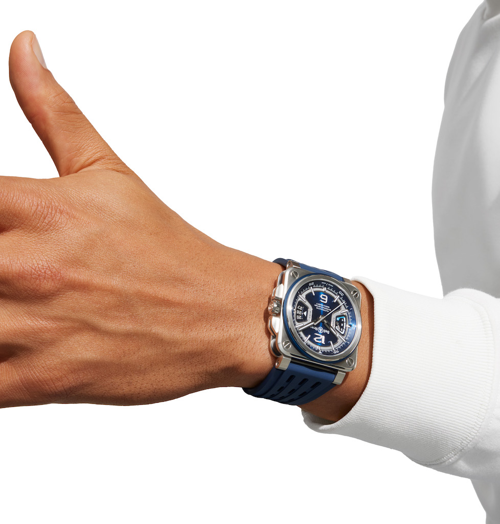 またデイト表示とパワーリザーブインジケーターを囲むようなX字型のデザインが、3層構造のダイアルをさらに引き締め、時計全体にメリハリを与えている。そうしたセンスの高さはベル&ロス創業者兼クリエイ ティブディレクター、ブルーノ・ベラミッシュならではの仕事ぶりと言えるだろう。