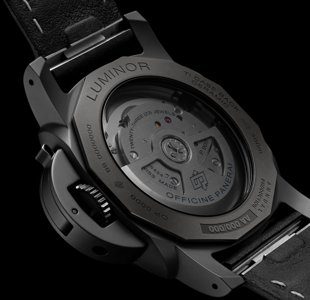 搭載するムーブメントは、自動巻きの「P.900」。初代トゥットネロの黒いムーブメントはシースルーバックから見ることができたが、後継モデルではソリッドケースバックとなり、ムーブメントを裏から楽しむことはなくなった。
