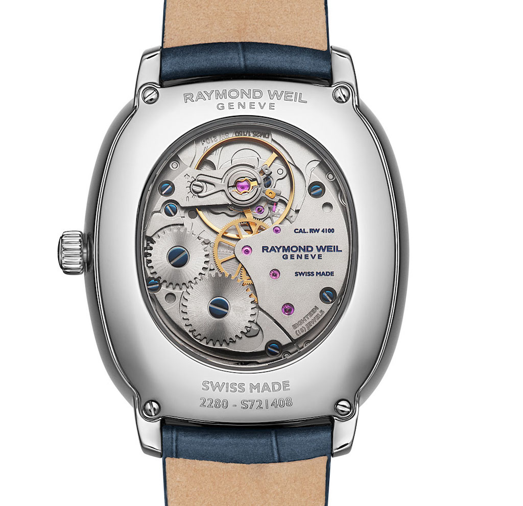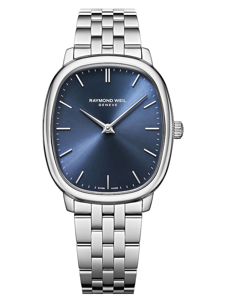 ダイアル色は「コッパー」「オールドシルバー」「ブルー」の3種類、ケースサイズは、横33㎜、縦38㎜。この絶妙なカラーチョイスと完璧なサイズ感はレイモンド・ウェイルならではのセンスの高さと言えるだろう。