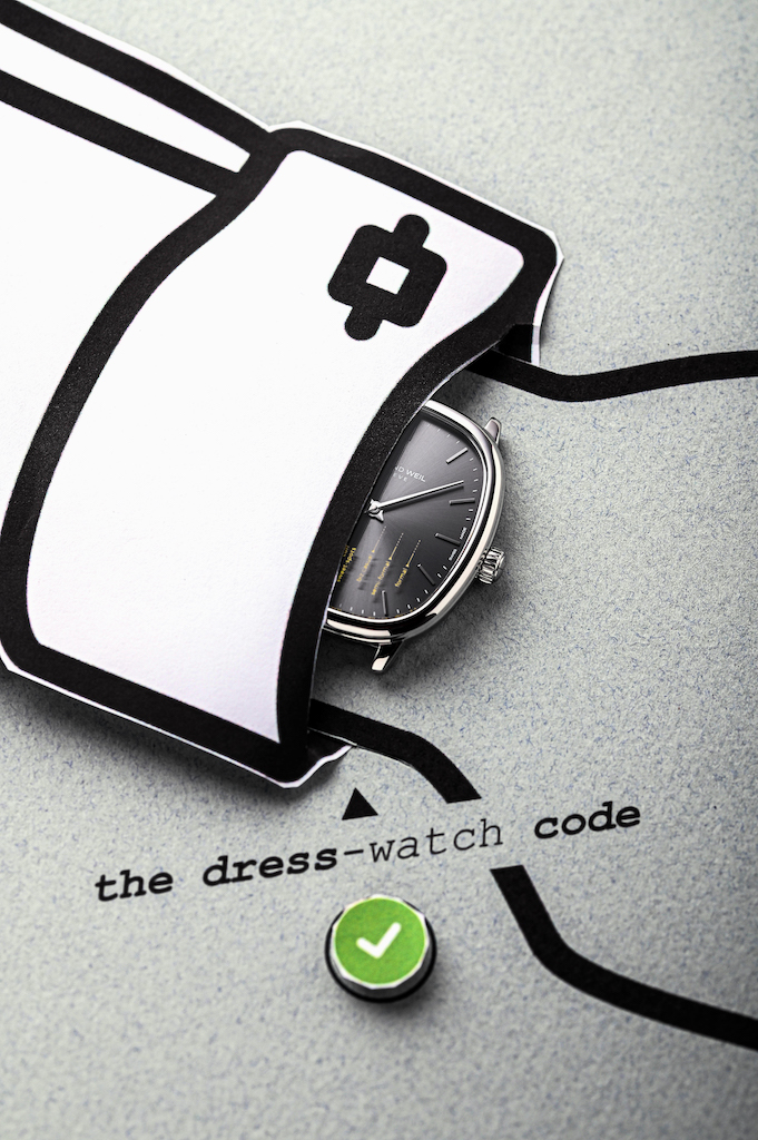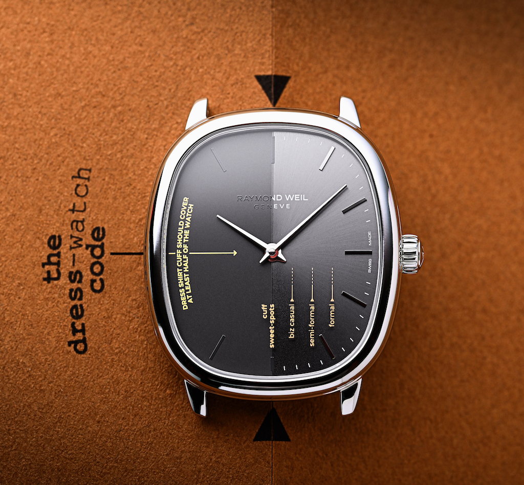 ドレスウォッチコードあるあるの「時計はシャツにどこまで隠すべき」を、ミリ単位でユーモアたっぷりに描いているのだ。ロマリック・アンドレ氏は、「時計の落ち着いた佇まいを尊重しつつ、同時にそれを破る衝動を抑えられない」と語っているが、これはそんな彼の哲学を体現したダイアルなのである。