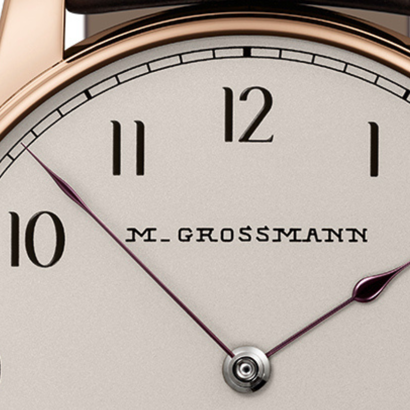 モデル名ともなっているアラビア数字インデックスは、ファーストモデルと同じフォントで細くシンプルに仕上げられ、ブラウンカラーで落ち着いた雰囲気に。分スケールもクラシカルなレイルウェイインデックスを採用。ブランドロゴと洋ナシ型の極細針は、モリッツ・グロスマンが19世紀に制作した懐中時計のオマージュとなっている。