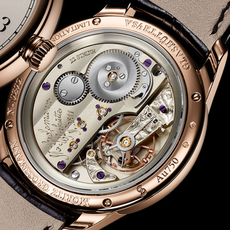 搭載するムーブメントはスモールセコンドを持つ、小径用に開発されたCal.102.1。直径26㎜、厚さ9.2㎜のキャリバーはグロスマンらしい3/5プレートを採用。地板とこのトッププレートを支柱で支えるグラスヒュッテ伝統の構造、テンプ受けのハンドエングレービングなどがシースルーのケースバックから視認できる。