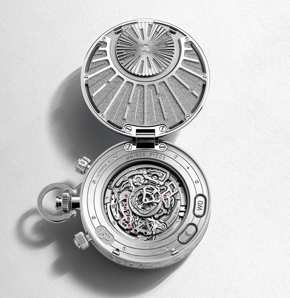 開いた状態の裏側。ユニバーサルカレンダーを操作する、ディスク状の巨大なリューズがまるで太陽のように美しく造作されている。懐中時計側のサファイアクリスタルは、スーパーソヌリ機構の音響盤を兼ねる。