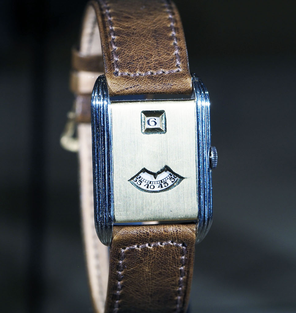「ネオ フレーム ジャンピングアワー」のモチーフとなった、1929年製モデル。ゴドロン層装飾が滑らかにラグにつながる流麗な造形美や、前面の2つの表示窓の形状などは、そまま新作に受け継がれている。