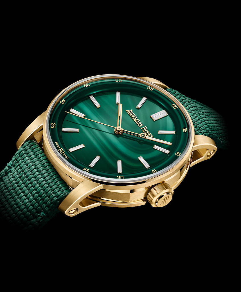 鮮やかなグリーンマラカイトのダイヤルには、18KYGケースが組み合わされている。変革、 成長、バランスの取れた感情を象徴するとされるマラカイトは、深いグリーンカラーに渦巻き模様が絡み合い、なんとも神秘的なダイアルに。またバゲットカットダイヤモンドのアワーマーカーとイエローゴールドの時・分針を配置することで、上品さはキープしながらも極めてゴージャスに仕上がっている。