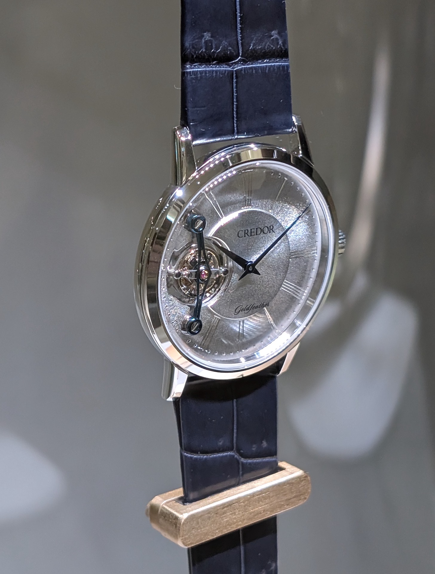 Watches and Wonders Genevaに初参加となったクレドール。日本のドレスウォッチとして美の頂点を極めるという信念のもと、「The Creativity of Artisans(匠たちの探求と豊かなる創造)」を体現するというブランド哲学を世界に向けて発信。早くもブースには世界中から多くの時計関係者が集まり、注目度の高さが感じられた。そんな記念すべき2026年の新作では、クレドールが30年にわたって築き上げてきた彫金とトゥールビヨンが見事に融合。ダイアルの繊細な表情は、全て手作業による彫金の賜物。洋彫りと和彫りの技法を取り入れ独自のバイト(彫刻刀)を自作することで、どの角度から見ても美しく輝く彫金面を生み出している。ローマ数字のインデックスも、全て手彫り。繊細な輝きのダイアルで、一際存在感を放っているのがトゥールビヨン。このキャリバー6850は、雫石高級時計工房において一貫して組立・調整からケーシングまでが行われている。手巻き。ケース径38.6㎜。プラチナケース。クロコダイルストラップ。3気圧防水。世界限定25本。2860万円。2026年8月7日発売予定。
