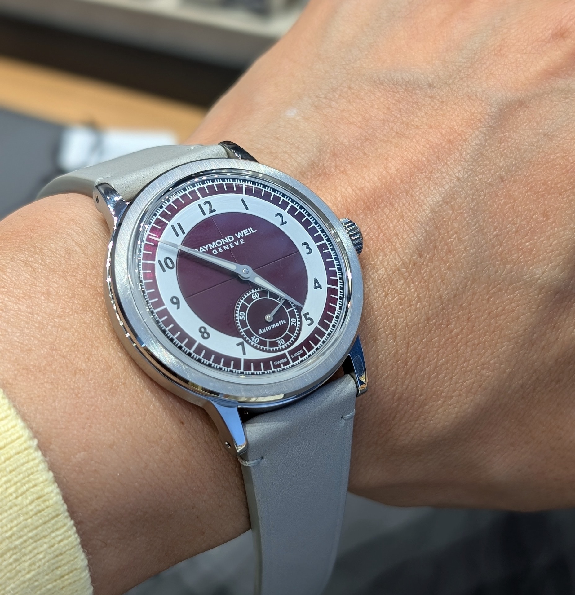 GPHG2023のチャレンジウォッチ賞を受賞した「ミレジム」の大成功で、クラシック路線を爆走するレイモンド ウェイル。その「ミレジム」コレクションのバリエーションが、さらに拡充された。1930年代のわずかな期間に製造されていたとされるセクターダイアル。その「時・分・秒」の目盛りをそれぞれ異なるトラックに配置するダイアルに組み合わされたのは、なんとも相性の良いツートーンのタキシードダイアルだ。同モデルでは初めてとなるアラビア数字のインデックスも採用されており、メリハリの効いたダイアルに仕上がると同時に、視認性の高さも実現されている。ダイアルの中央部には縦筋目のヘーライン仕上げ、アワートラックにはマット仕上げ、ミニッツトラックには同心円状のサーキュラー仕上げといった具合に、各セクターで繊細な表情を実現。さらに、わずかに傾斜したミニッツトラックの表面構造に沿うよう、分針の先端には曲げているなど、クラシカルなディテールへの徹底したこだわりが感じらえる。なお、写真のレッドグレープ×ホワイトの他に、クリーム×ブラック、ミッドナイトブルー×ブラックのダイアルも用意されている。自動巻き。ケース径39.5㎜。SSケース。カーフレザーストラップ。5気圧防水。37万4000円。