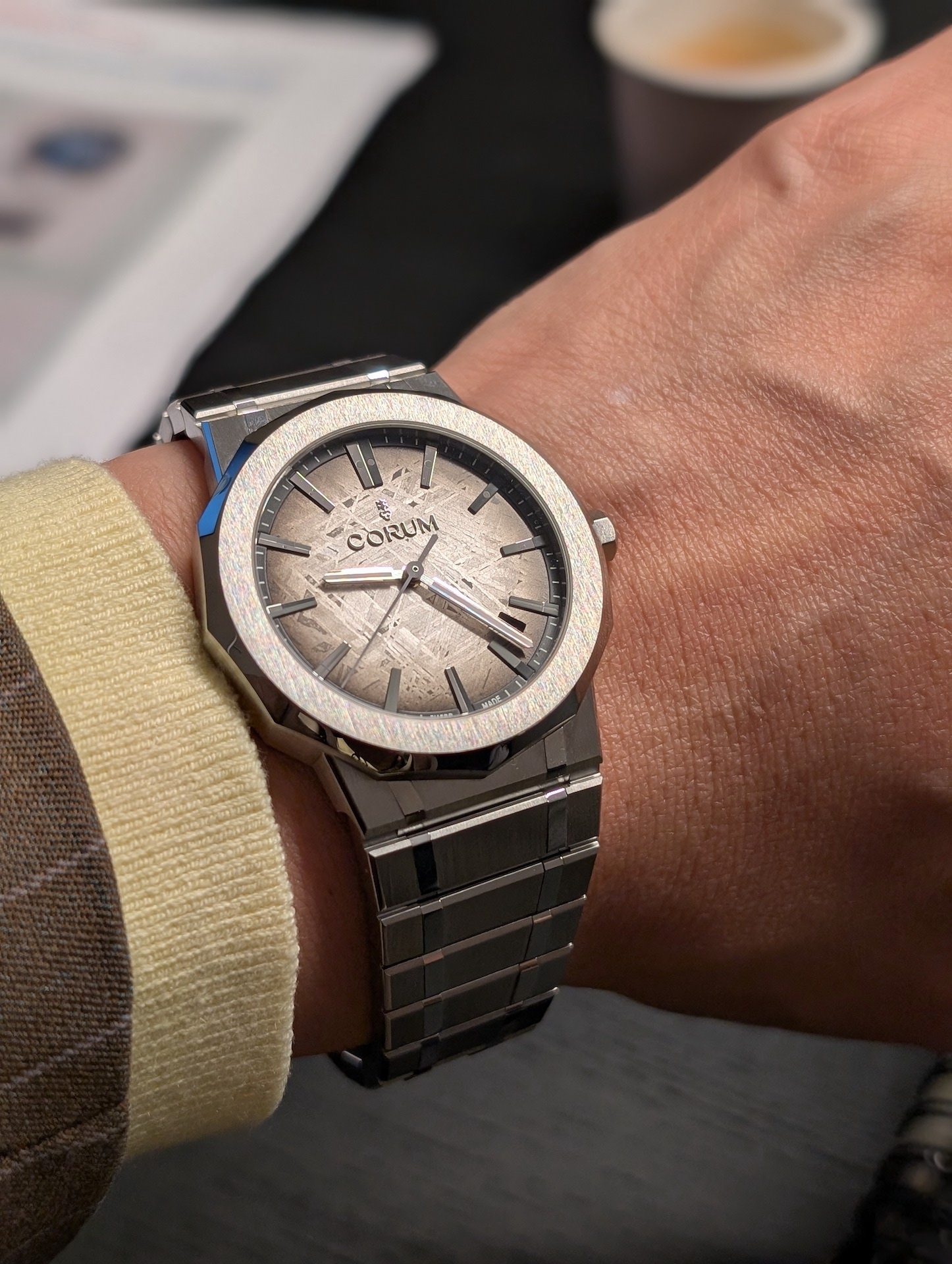 コルムは今年、ブランドの象徴的な存在である「アドミラル」コレクションを一新。これは単なるリニューアルということではなく、あらゆる設計をイチから見直してコレクションの本質を追求したもの。ケース径39㎜と36㎜の2サイズ展開で、全11モデルがラインナップした。写真は39㎜モデル。「国際海洋信号旗インデックスが、なくなった!?」と心配になった方、どうかご安心を。シンプルになったインデックスをよーく見れば、国際海洋信号旗がさり気なくデザインされているではないか! そして特徴的な12角形ケースはもちろん継承されているが、注目は完全新設計のインテグレーテッドブレスレット。バックルに向かって絶妙に細くなるようテーパード角度が見直され、両開きのバックルには腕に着けた時ブランドの鍵モチーフのロゴマークがつなぎ目でピタッと合うようにデザインされている。ダイアルに採用されているのは隕石(メテオライト)だ。ちなみにコルムは、1986年に世界でいち早く隕石を時計に取り入れた先駆的ブランドである。またムーブメントにも変更が。コンセプト社との共同開発により新たに誕生した、コルム専用の自動巻きムーブメントを搭載している。約72時間のパワーリザーブを確保しつつ、ケース厚8.90㎜という薄型を実現しており、鍵モチーフのロゴはローターにもデザインされている。自動巻き。ケース径39㎜。SSケース&ブレスレット。5気圧防水。価格未定。